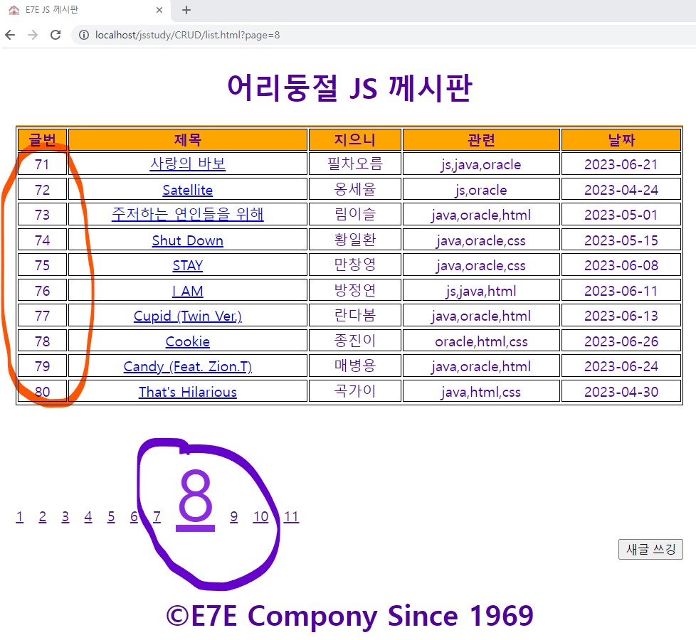위 코드에서 페이지별 시작글 인덱스와 끝글 인덱스를 구했기 때문에 리스틀 출력할 때(getList함수)
