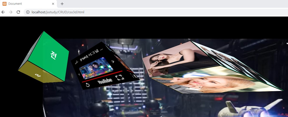 아래 소스는 위 CUBE 소스에, Youtube영상과 이미지를 추가하고, 단지 뺑뺑 돌렸당
