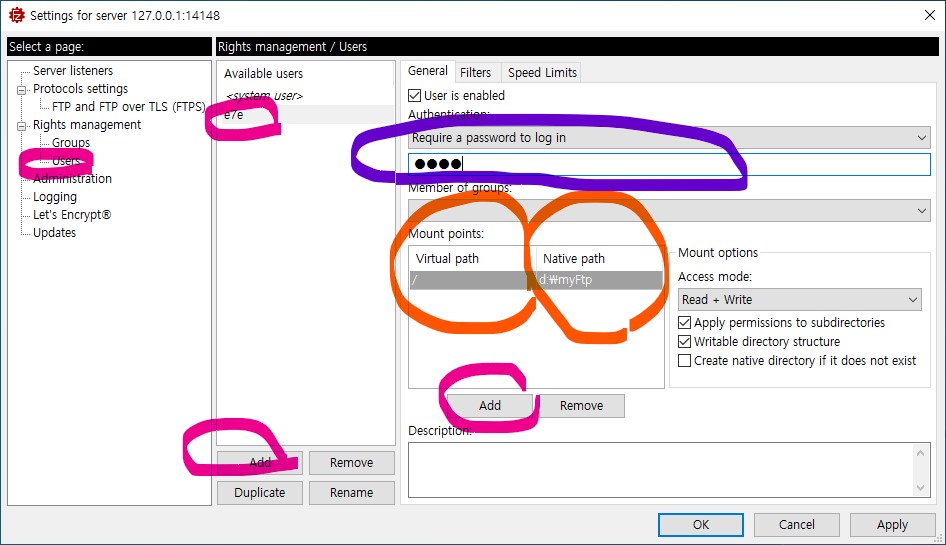위 그림을 설명하면 사용자 e7e를 추가하였고, 암호를 부여했으며,