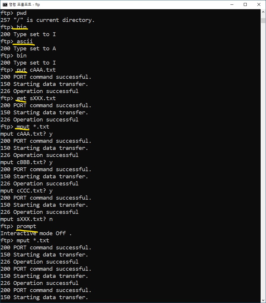 mput은 마니 보내기란 사실을 느끼게 된당. bin/ascii 명령은 전송모드를 binary/text로 설정하는 건뎅