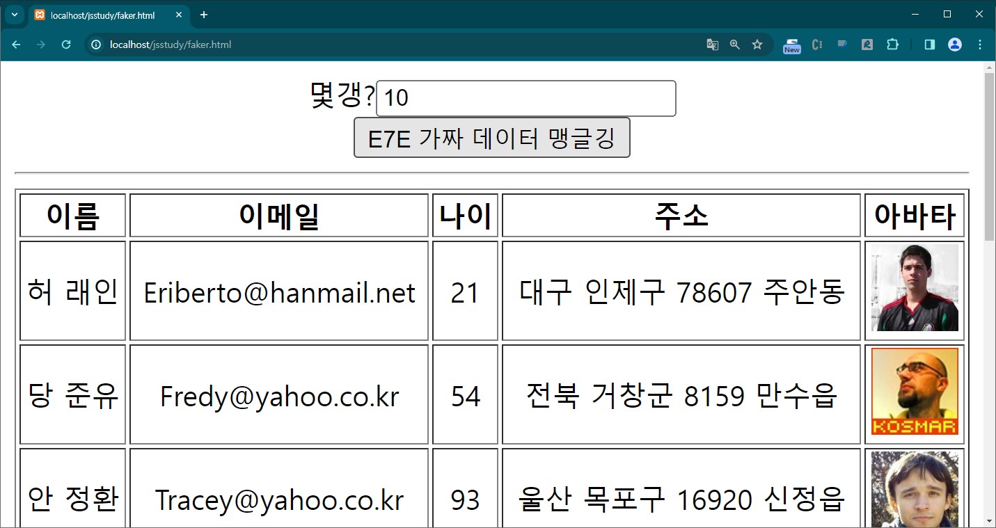 위 faker-js를 활용하여 아래 그림과 같이 필요한 갯수의 랜덤한 데이터를 맹글려 한다치면
