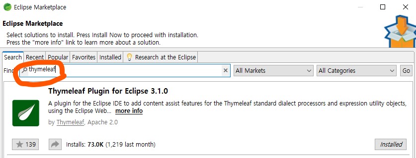 Help -> Eclipse Marketplace 에서 thymeleaf로 검색해서 아래 plugin을 설치한당.