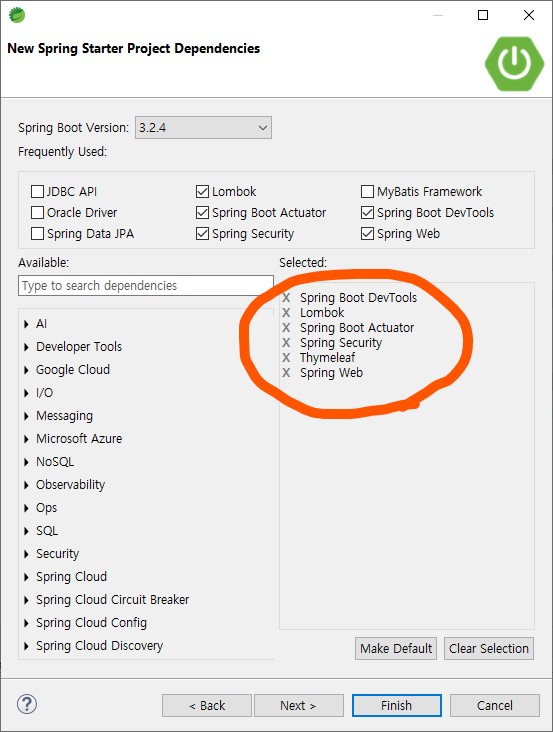 다음 화면에서 아래와 같은 Dependencies를 선택하공, Finish를 꾸욱 누른당.