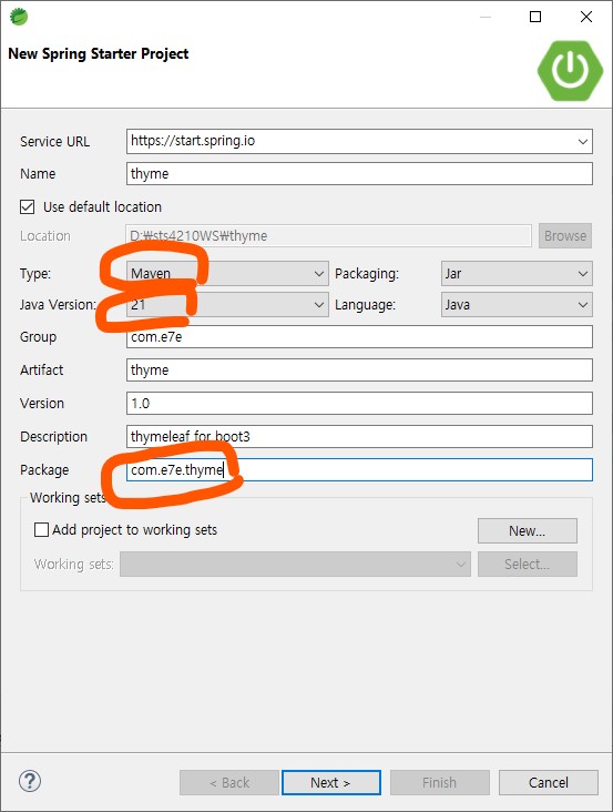 File -> New -> Spring Starter Project를 선택 아래처럼 입력한당