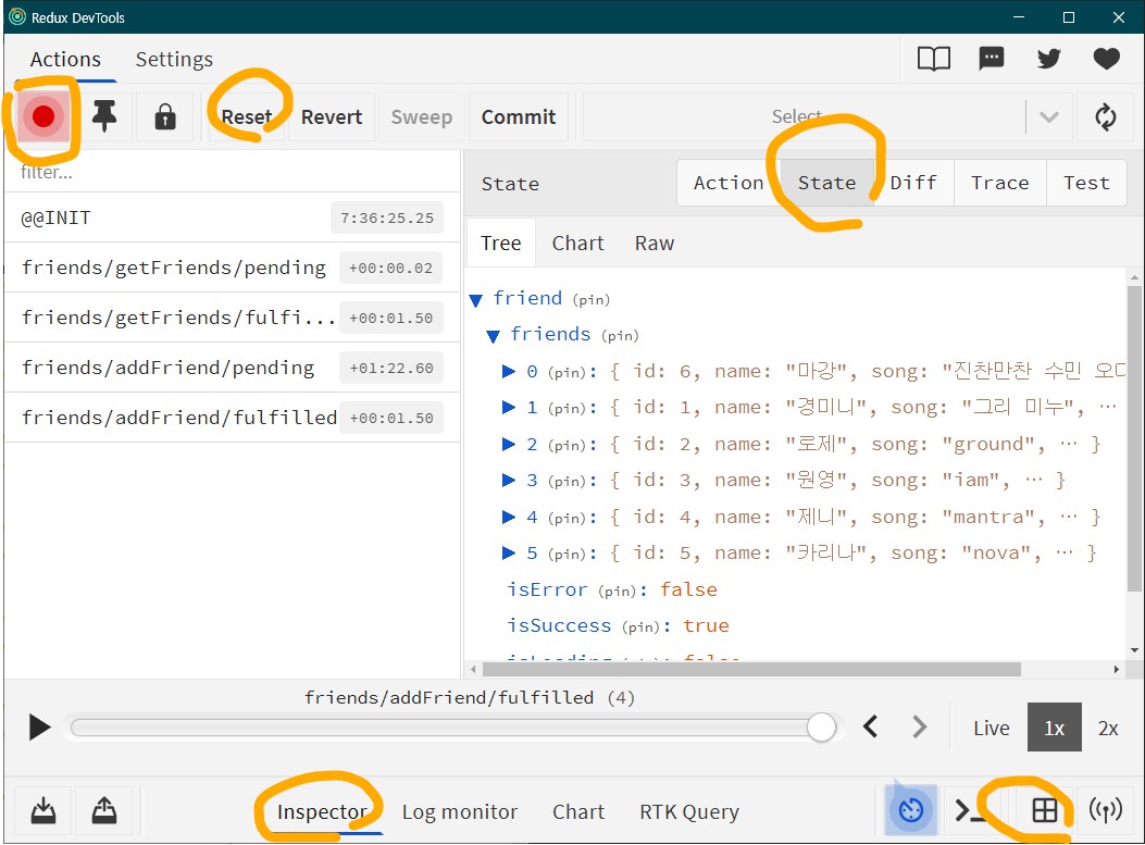 Redux DevTools 에 레코딩 된 결과는 아래와 같당.