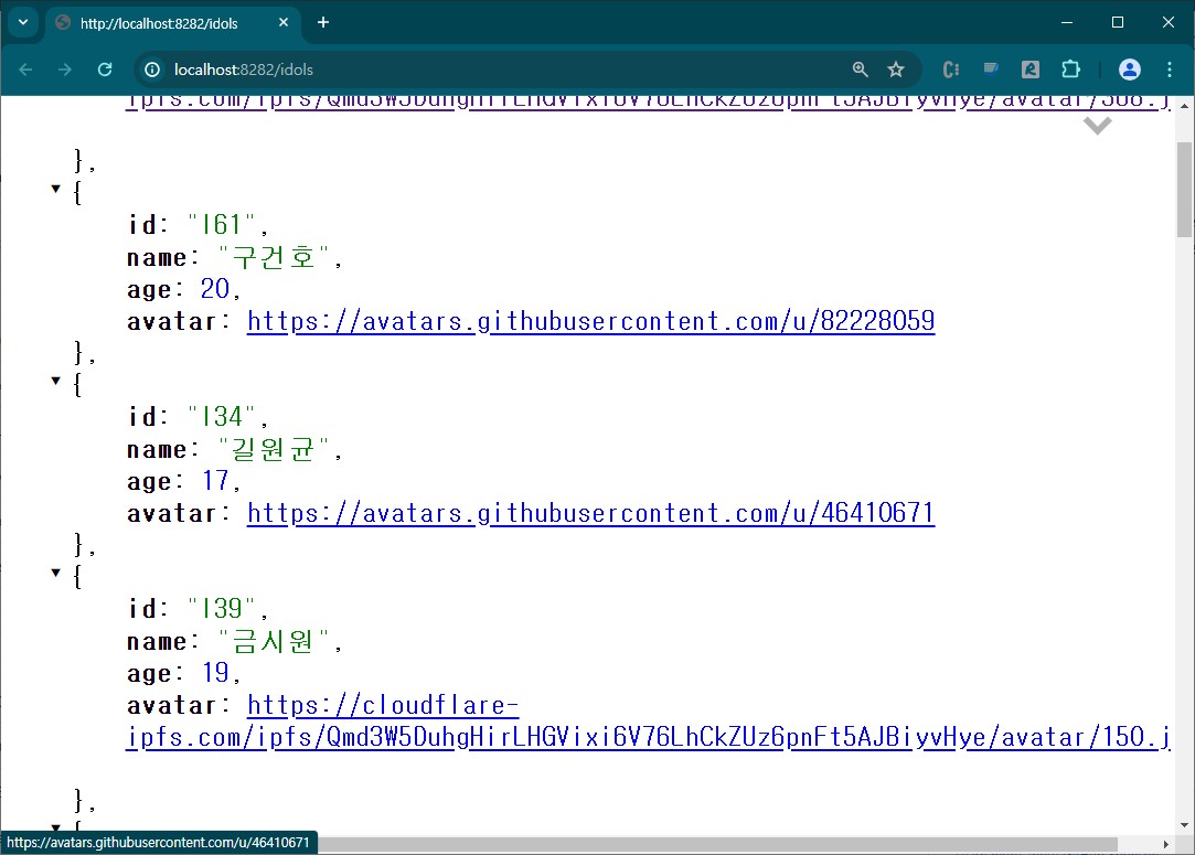 브라우져 주소표시줄에 http://localhost:8282/idols/I61 이라고 쳐 보장.
