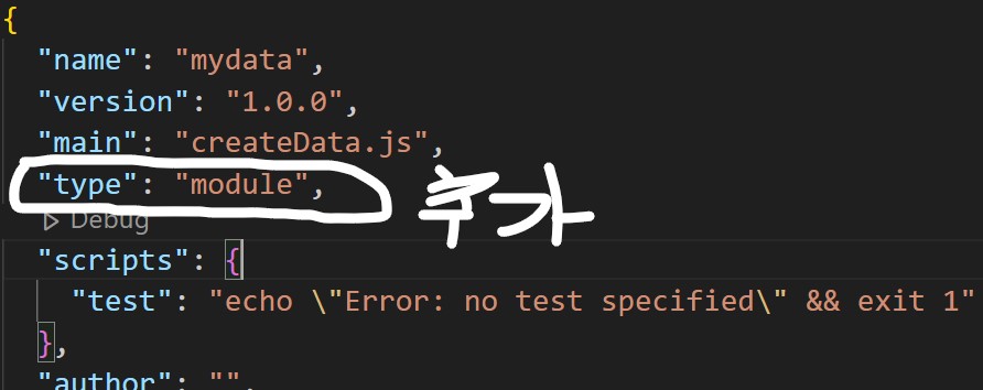 package.json 파일을 에디터(vscode?)로 열고, 아래 그림의 하이얀 부분을 추가하장!