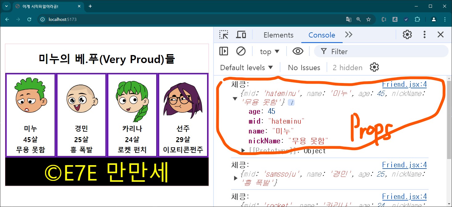 <Friend mid="hateminu" name="미누" age={45} nickName="무용 못함" />
