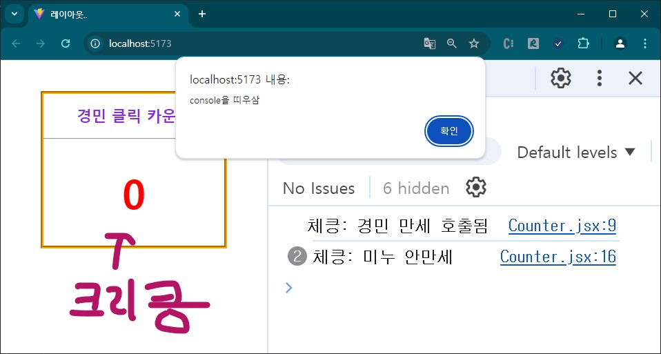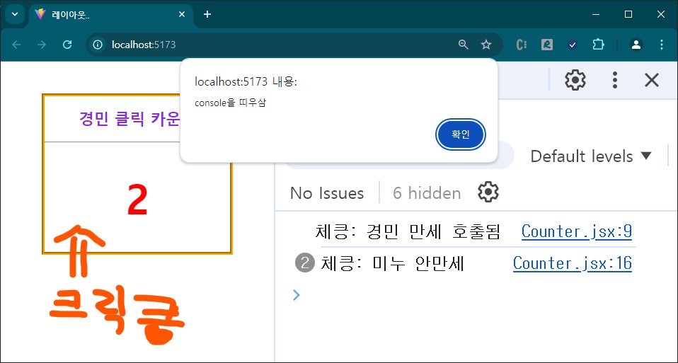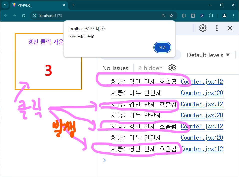 클릭 할때마당, 경민 만세 호출됨이 console에 찍힌당. 무신 의미 일깡?