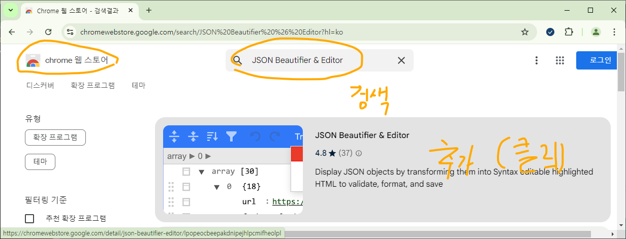 만약 구글에서 "Chorme 웹 스토어" 로 검색 후 웹스토어에서 아래 처럼 "JSON Beautifier..." 검색후