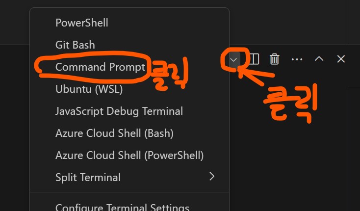 확인했다면 서버가 돌도록 그대로 두고 vscode에서 cmd 터미널을 한개 더 열도록 하장