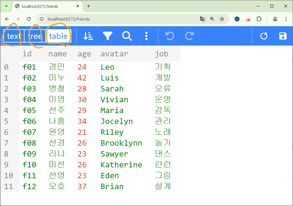 { "id": "f12", "name": "오호", "age": 37, "avatar": "Brian", "job": "설계" }