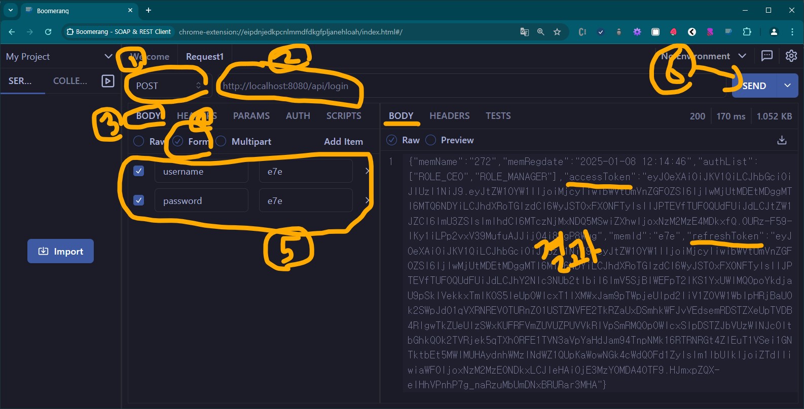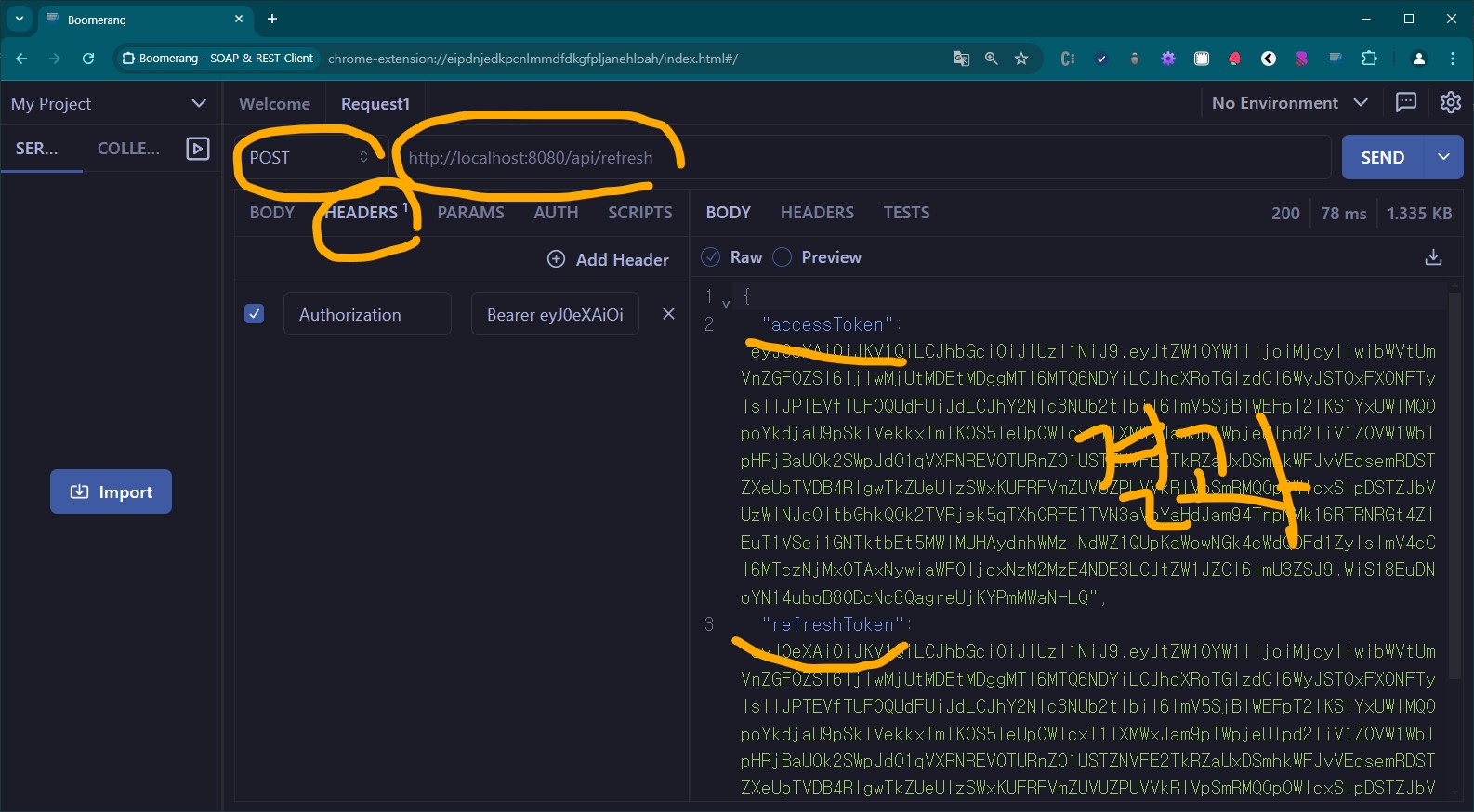 "/api/refresh" 컨트롤러를 테스트 해보자. 아까 받았던 Refresh Token값을 저장해 두었어야 한다.
