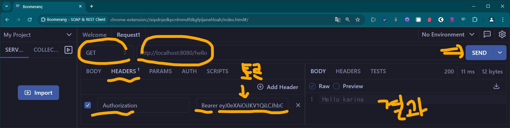 받은 토큰을 Header에 담고서 "/hello" 요청 -> 썽공