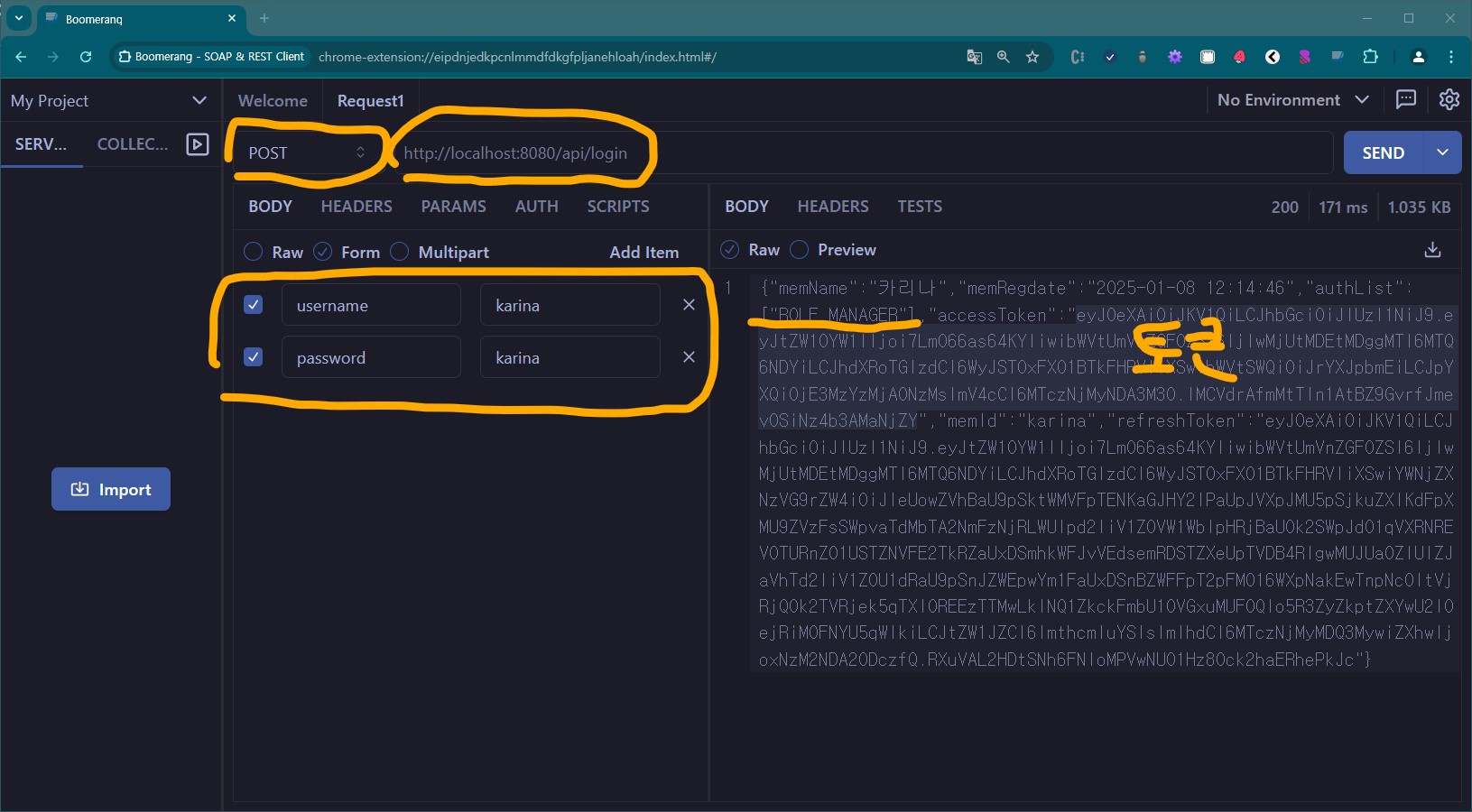 username/password에 karina/karina 를 입력 후 "/api/login" 에 요청, 어딘가에 토큰 저장(메모장?)