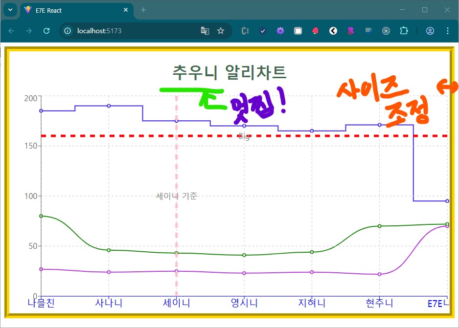 ResponsiveContainer 와 기준선을 넣어 줄 수 있는 ReferenceLine 을 추가하면서