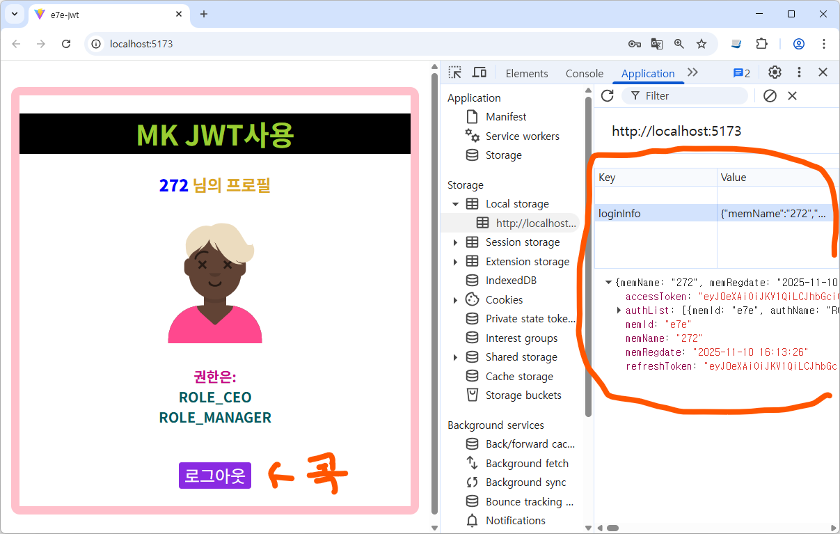 Profile.jsx 는 로그인 성공하면 localStorage 정보 읽어 사용자 정보 뿌리는 애