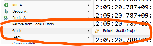 build.gradle 파일을 수정하면 마우스 오른쪽 눌렁, 아래와 같은 Refresh를 잊지 말장.